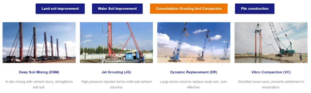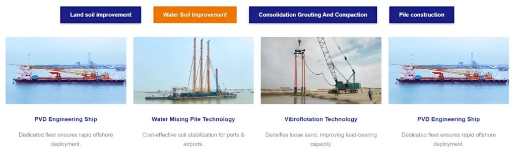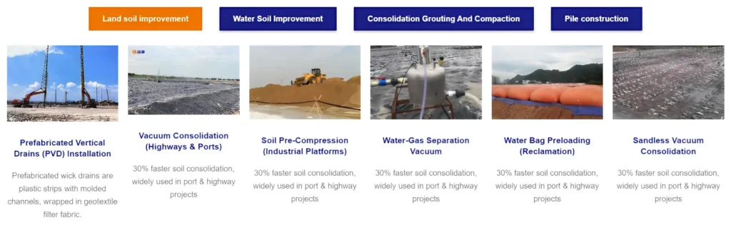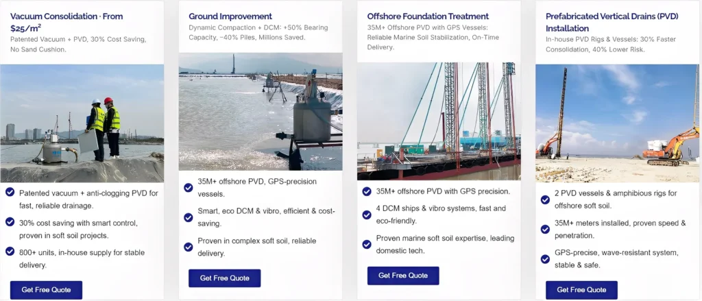 We provide vacuum preloading, dynamic compaction, PVD wick drain installation, deep soil mixing, and offshore ground improvement. Methods are selected based on soil conditions and project requirements.