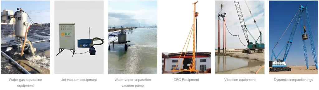 Kami menyediakan pra-pemuatan vakum, pemadatan dinamik, pemasangan saliran sumbu PVD, pencampuran tanah dalam, dan penambahbaikan tanah luar pesisir. Kaedah dipilih berdasarkan keadaan tanah dan keperluan projek.